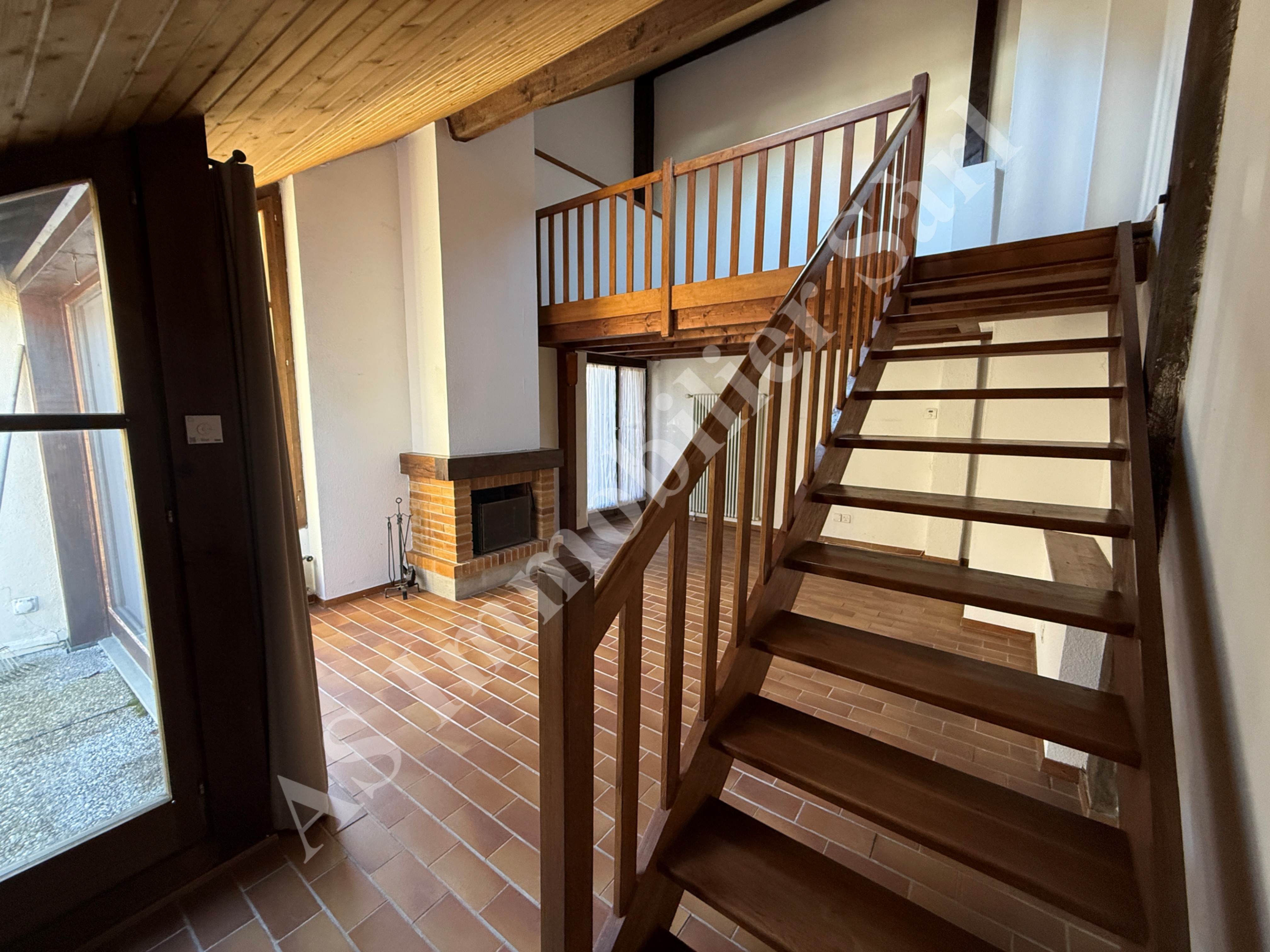 Séjour lumineux de 28.5 m2 avec cheminée & mezzanine, espace chaleureux et accueillant avec accès direct à une terrasse de 62 m2, idéale pour profiter des beaux jours